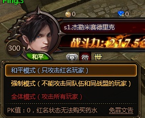 1.和平模式:只攻击红名玩家,杀红名不增加PK值